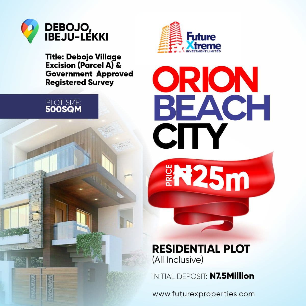 ORION BEACH CITY is located in Debojo- Eleko (along the lekki coastal road) which is one of the finest areas in Ibeju- Lekki.